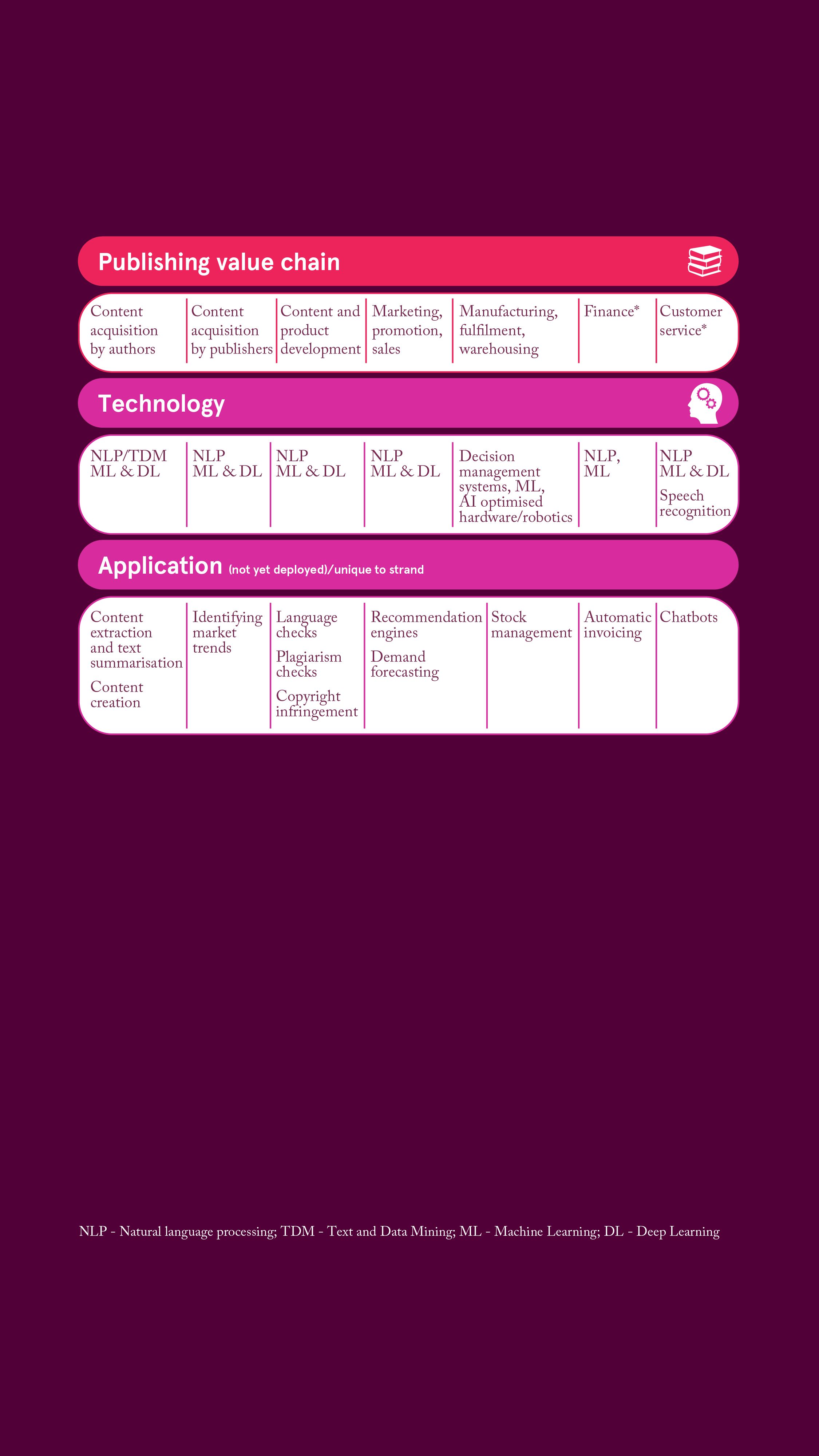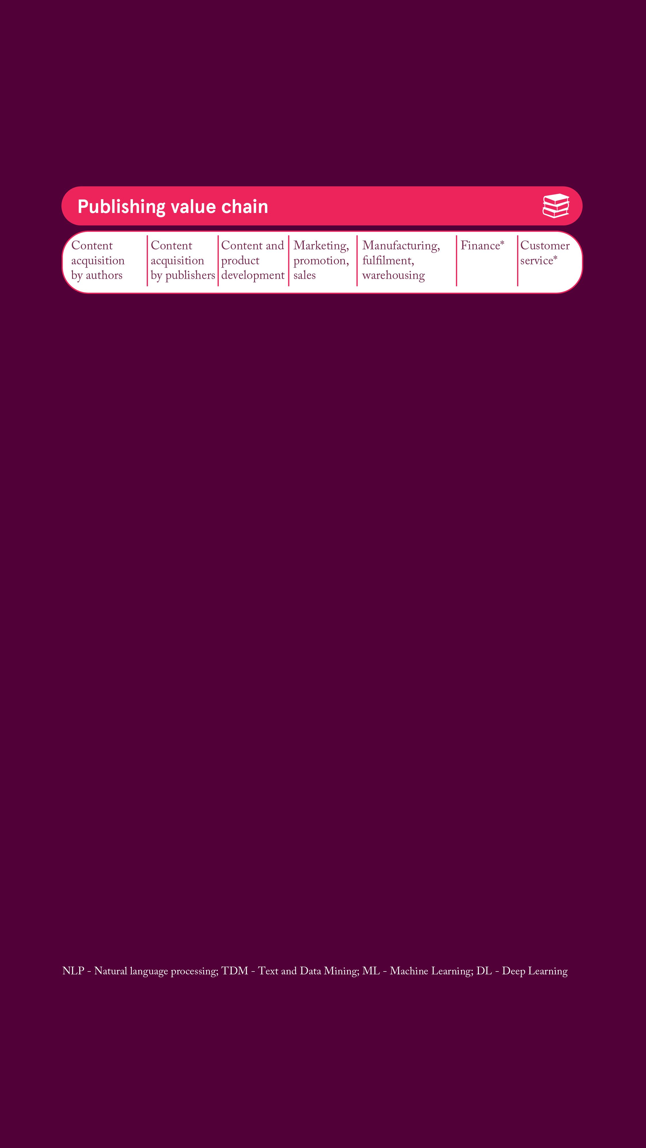 - AI is being applied throughout the value chain by some academic, education and consumer publishers to drive benefits for their organisation (such as improved IP protection, content discoverability, market prediction and other strategic insights) and for their customers (by conducting routine search and summarisation tasks and generating new insights, AI is freeing up researchers, authors, teachers and consumers to focus on value-add or creative tasks).