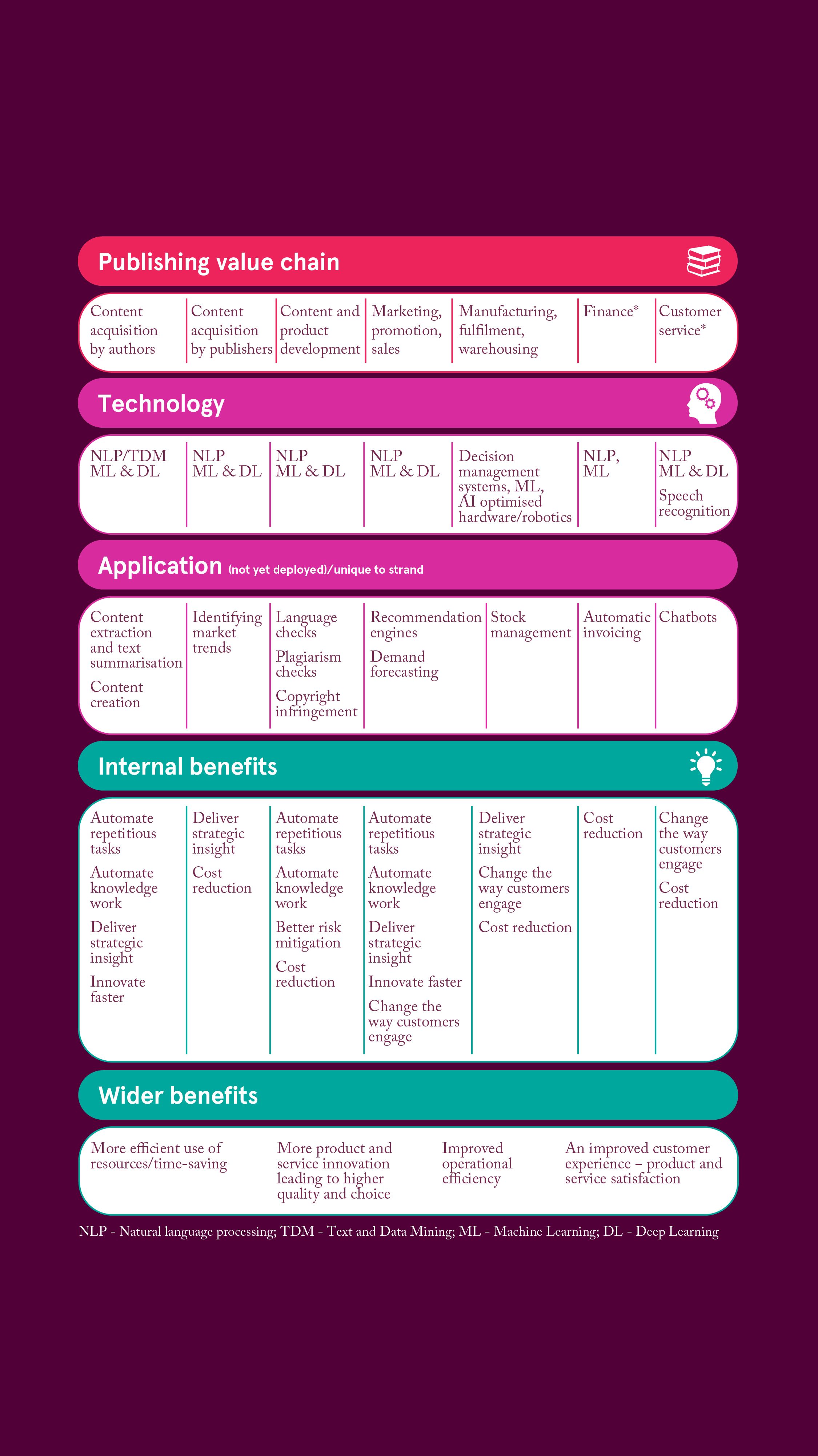 The taxonomy highlights that the AI technology focus for publishing is a combination of text and image recognition technologies with machine and deep learning. AI can be applied in a wide range of ways throughout the publishing supply chain to generate benefits both to publishers and consumers – for example, time-saving benefits, speeding up, improving the quality of and providing additional insights for innovation activities, improving operational efficiency and cost savings, and improving the customer experience.